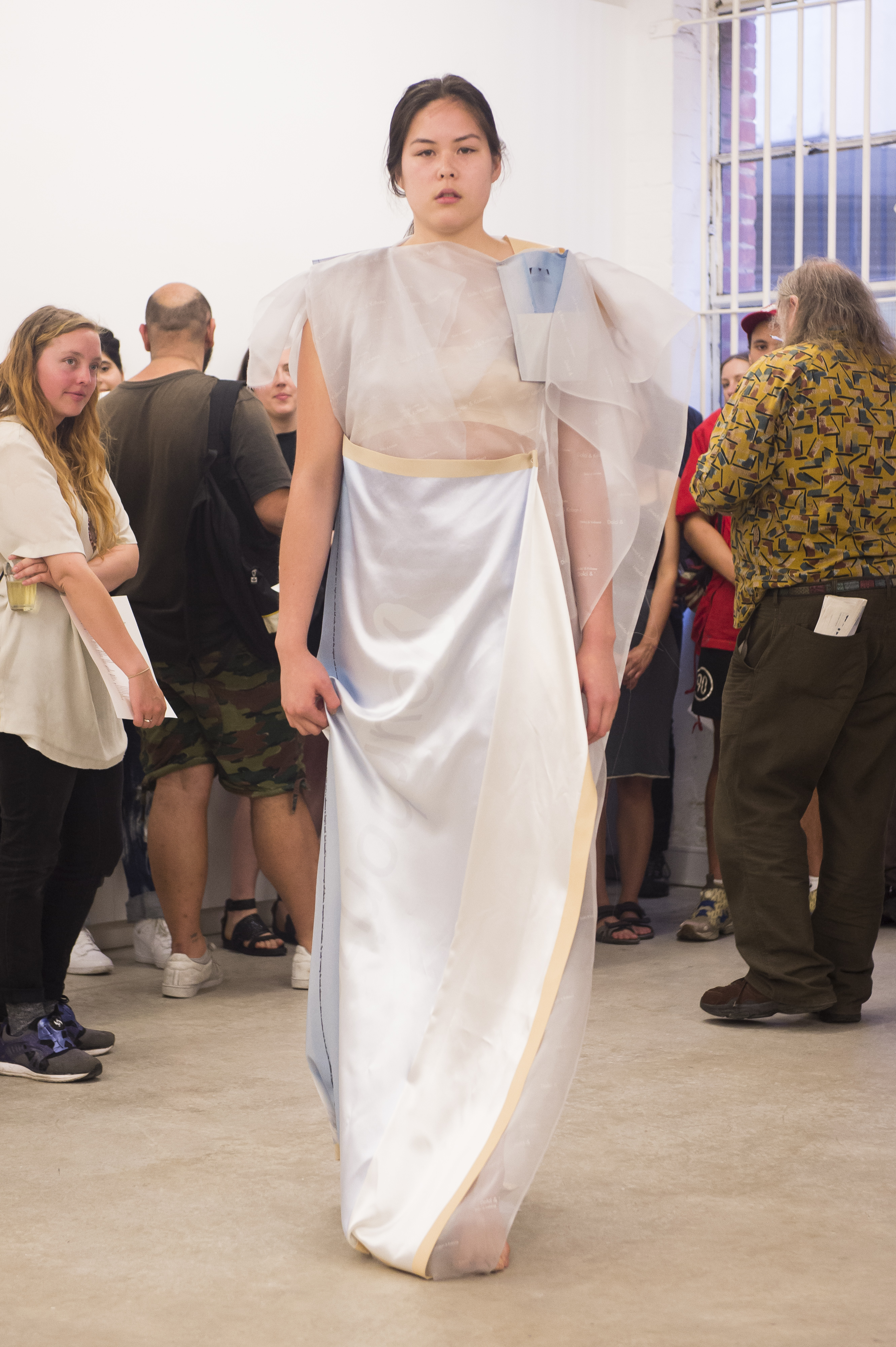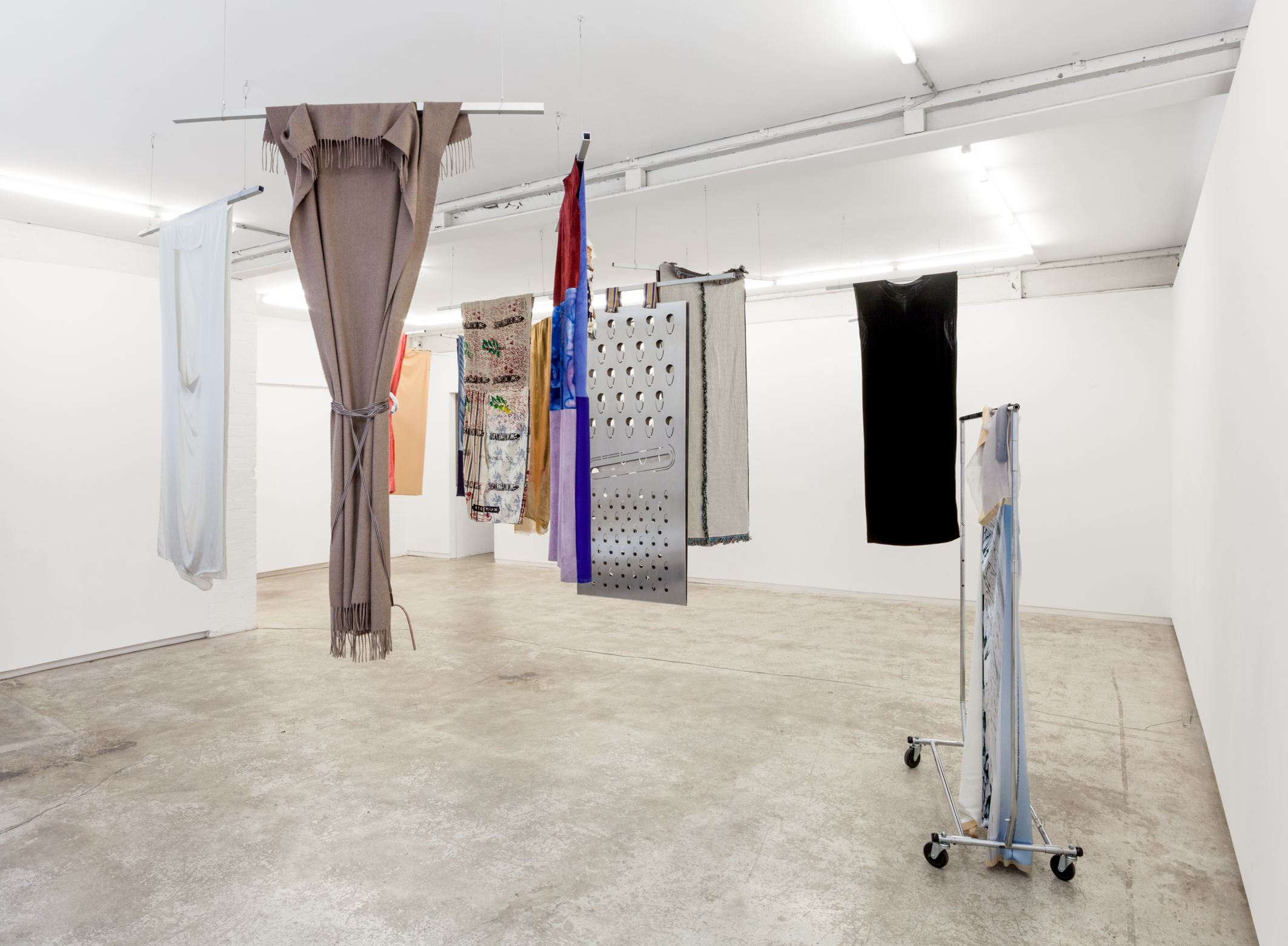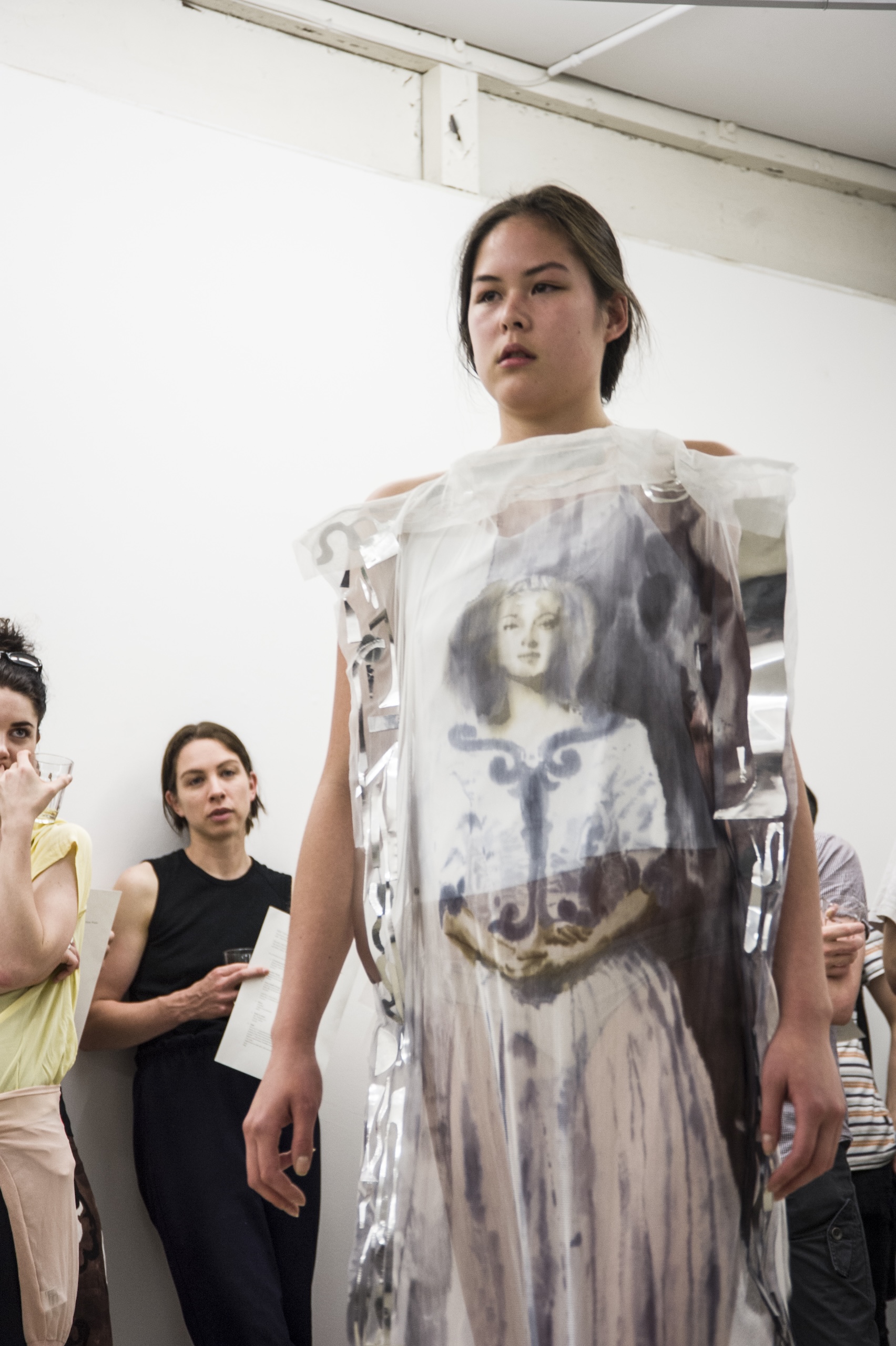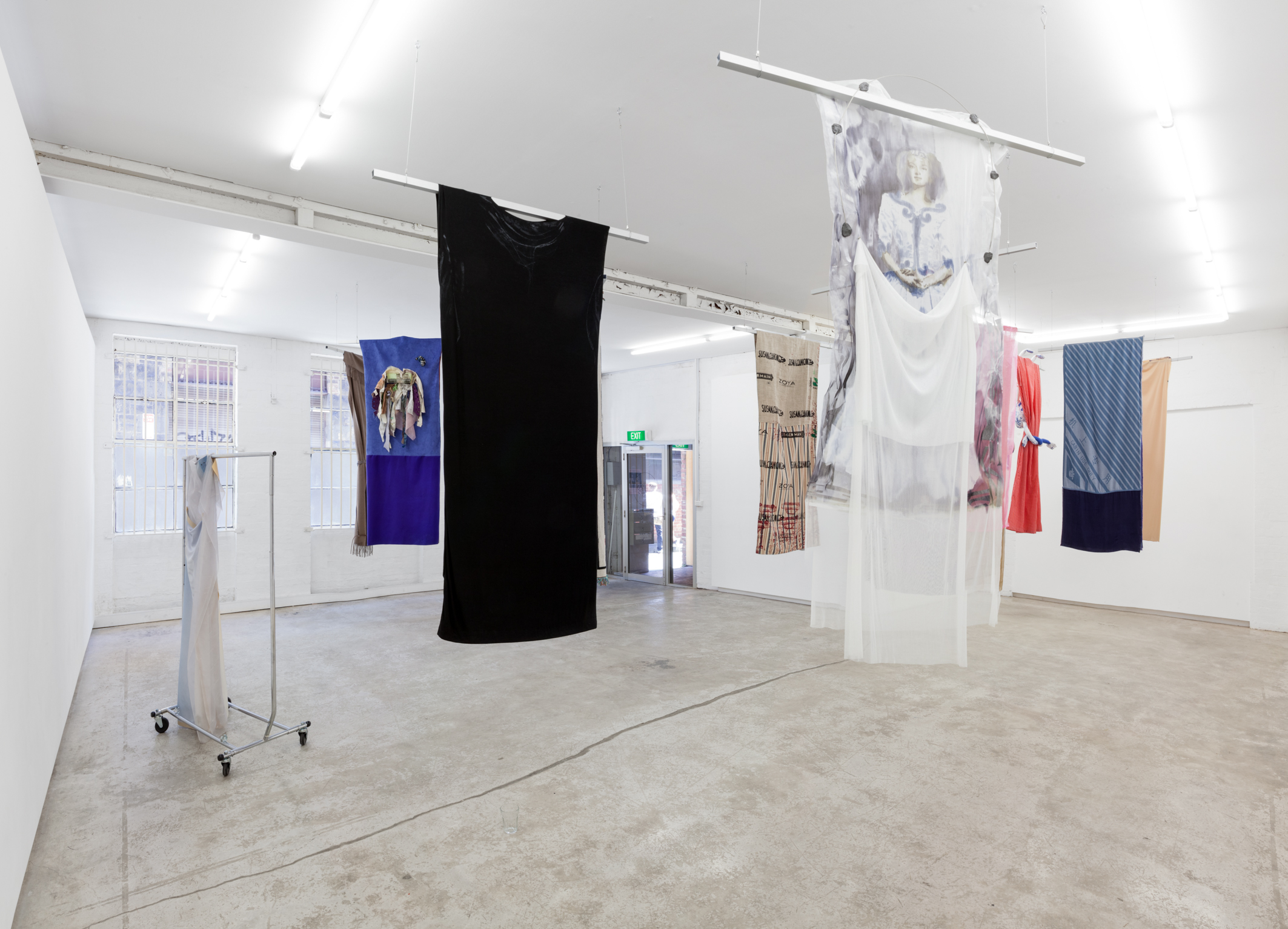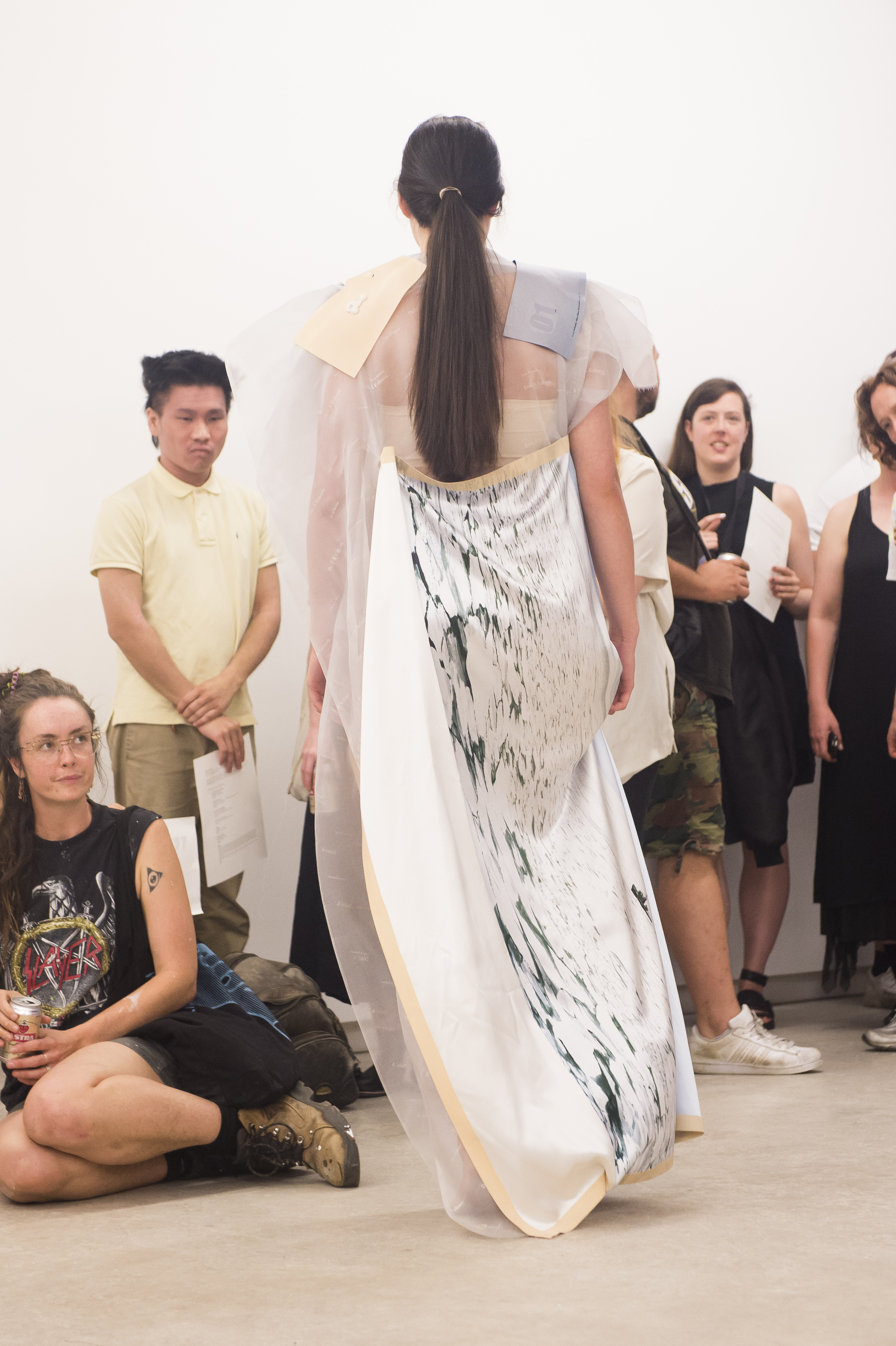Each work is first revealed in a catwalk performance on opening night, worn by a lone model. She glides through the gallery along a set path before returning backstage to don the next canvas. Once the procession ends, the garments are lifted as wall hangings—hung from suspended poles threaded through their armholes.