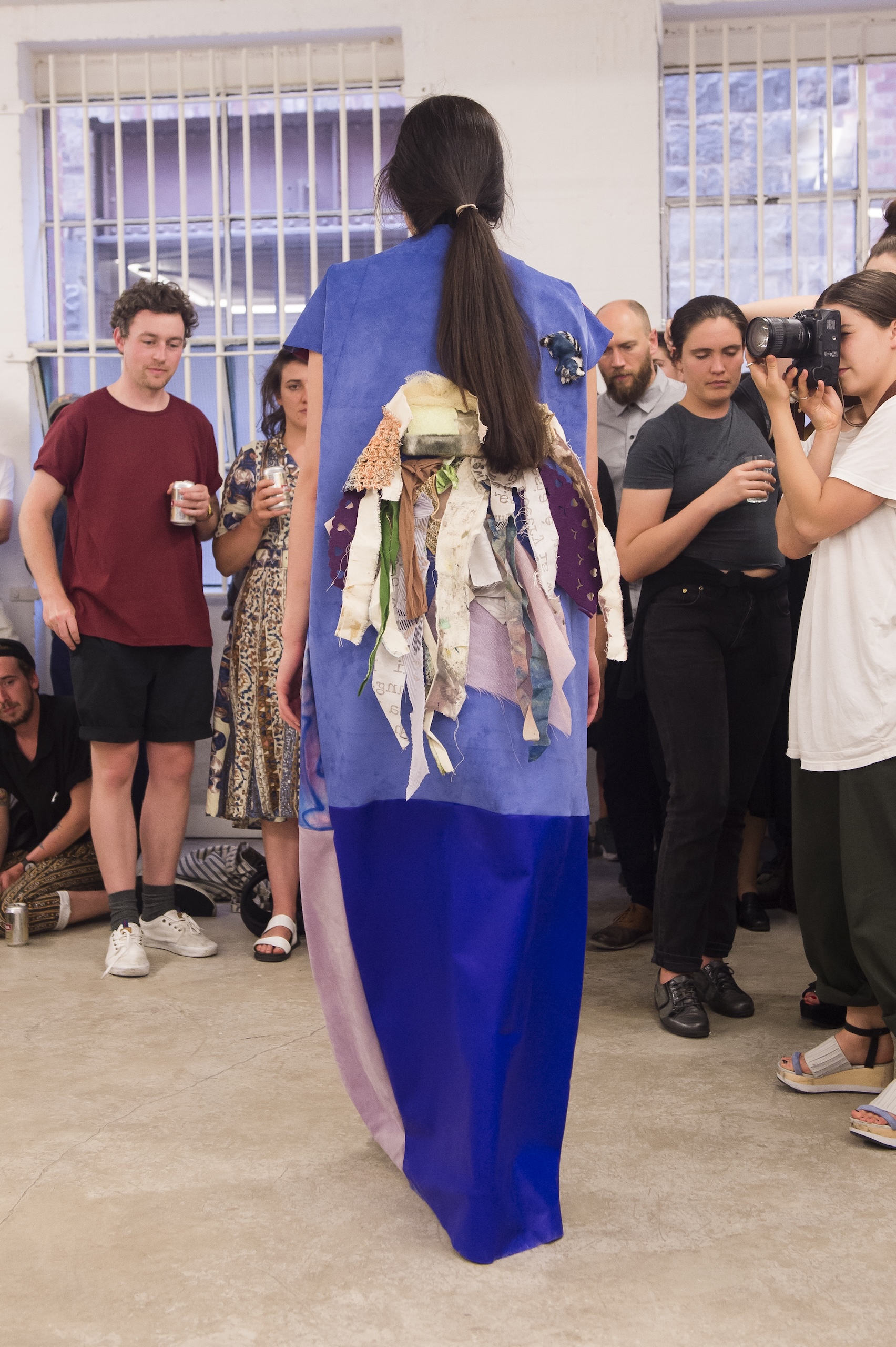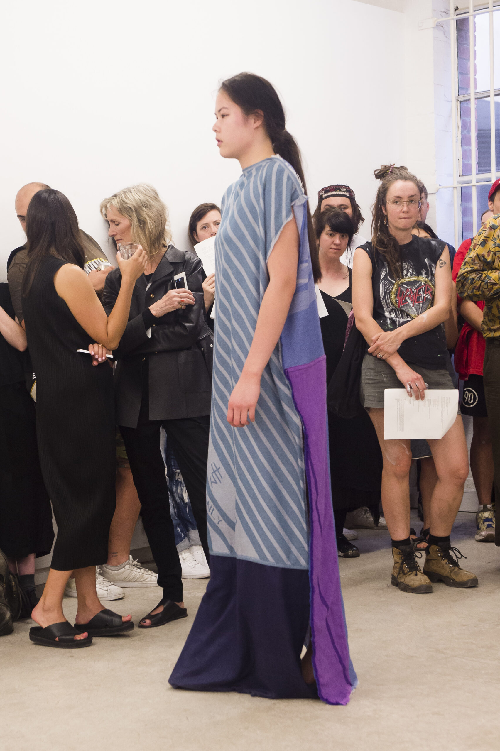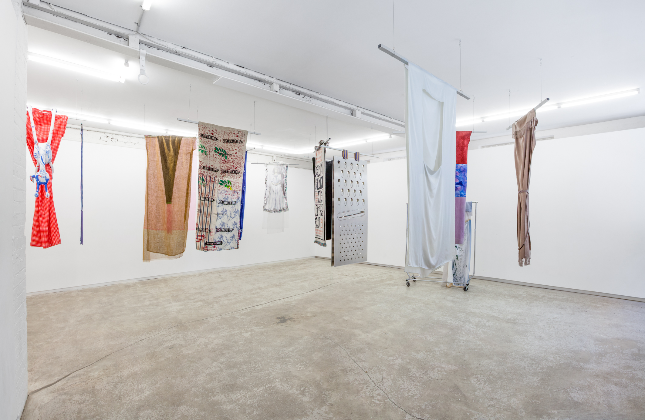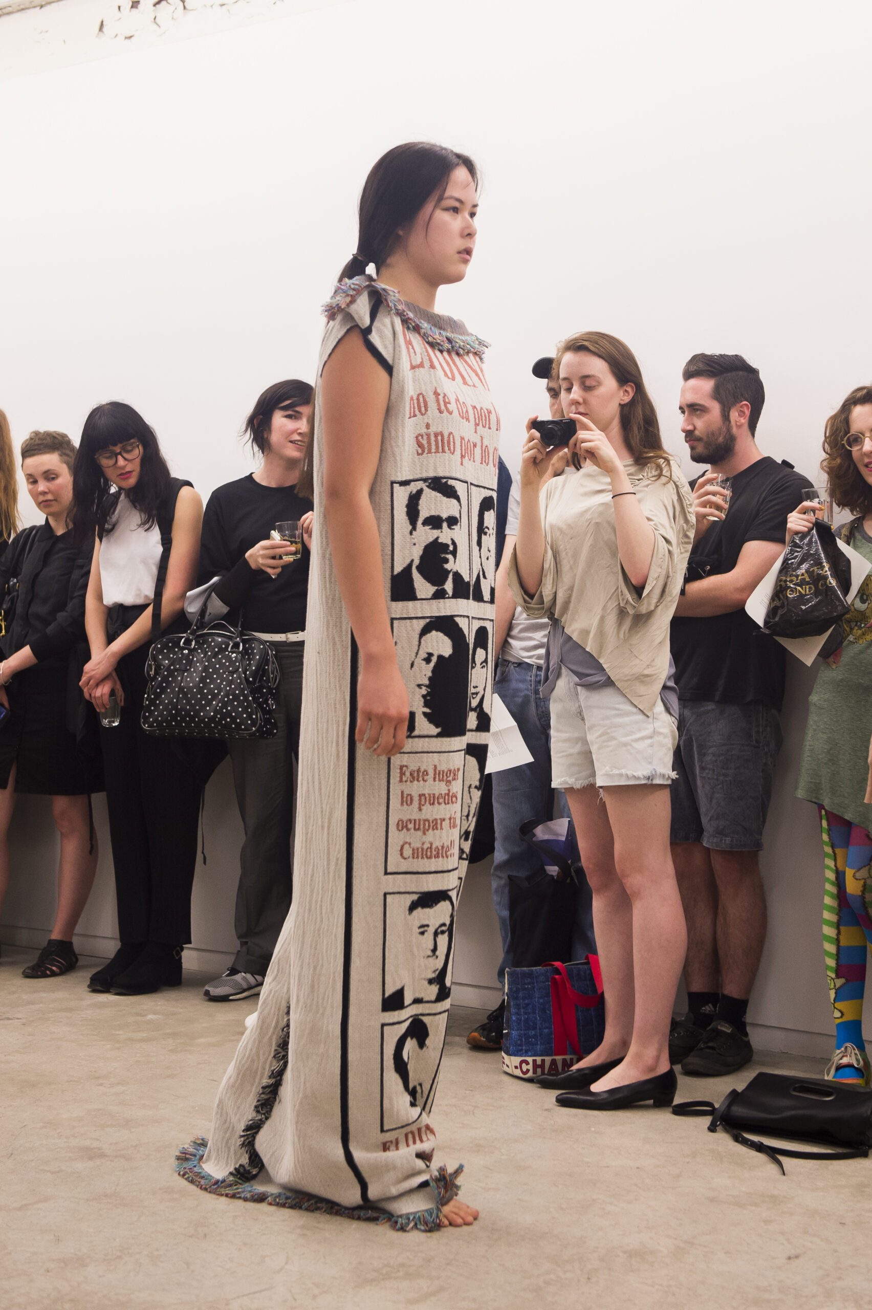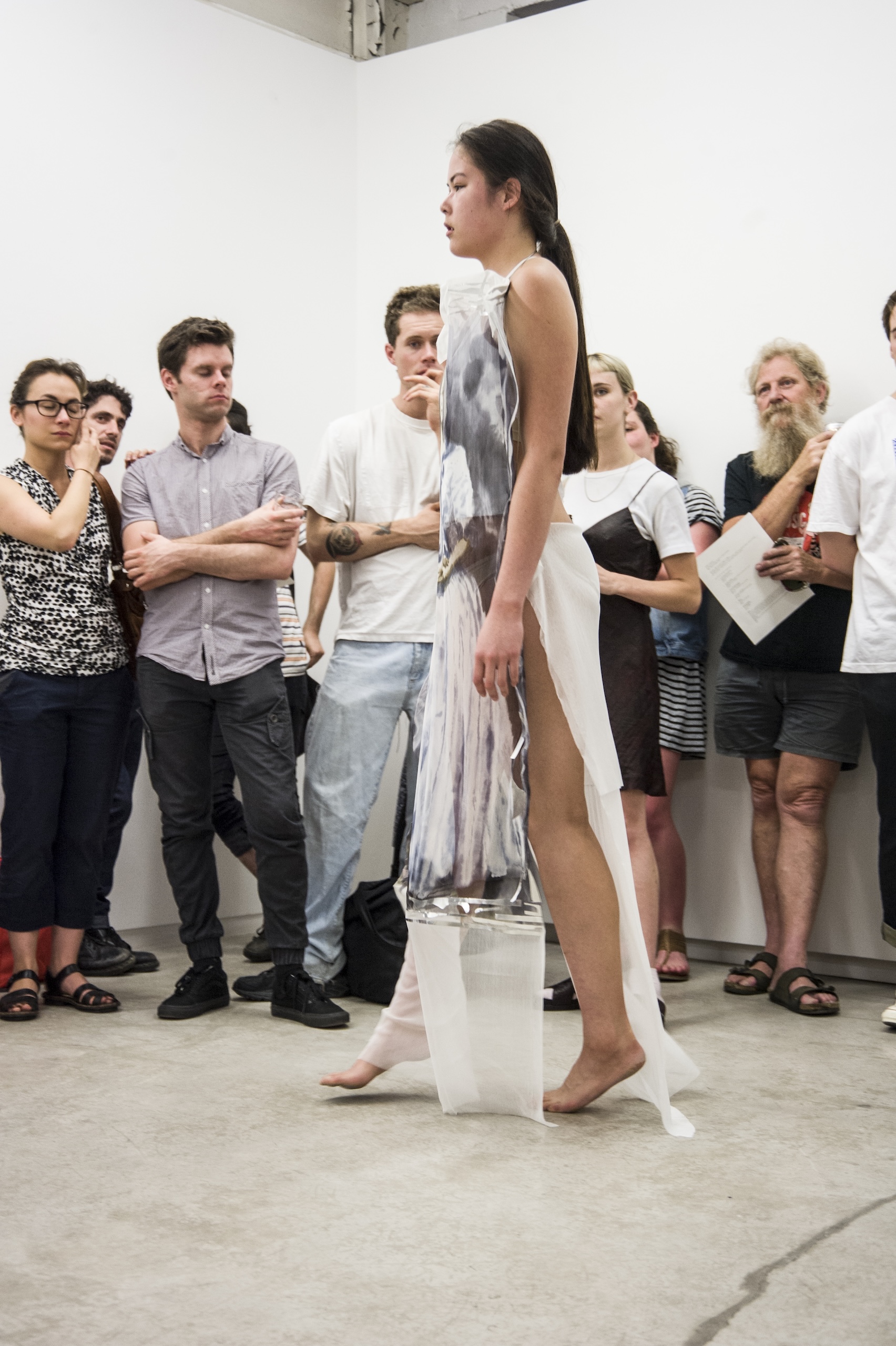 Each work is first revealed in a catwalk performance on opening night, worn by a lone model. She glides through the gallery along a set path before returning backstage to don the next canvas. Once the procession ends, the garments are lifted as wall hangings—hung from suspended poles threaded through their armholes.