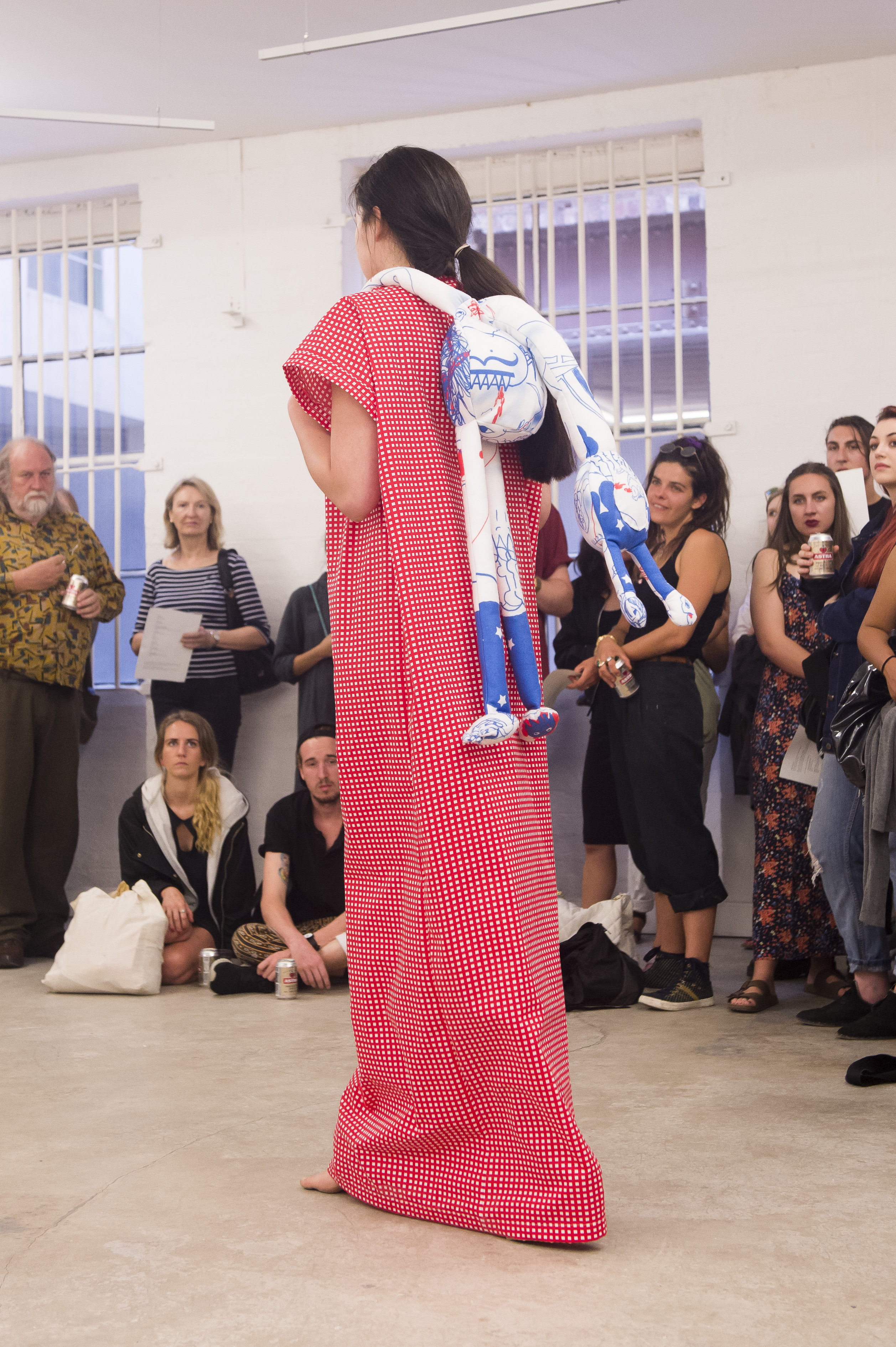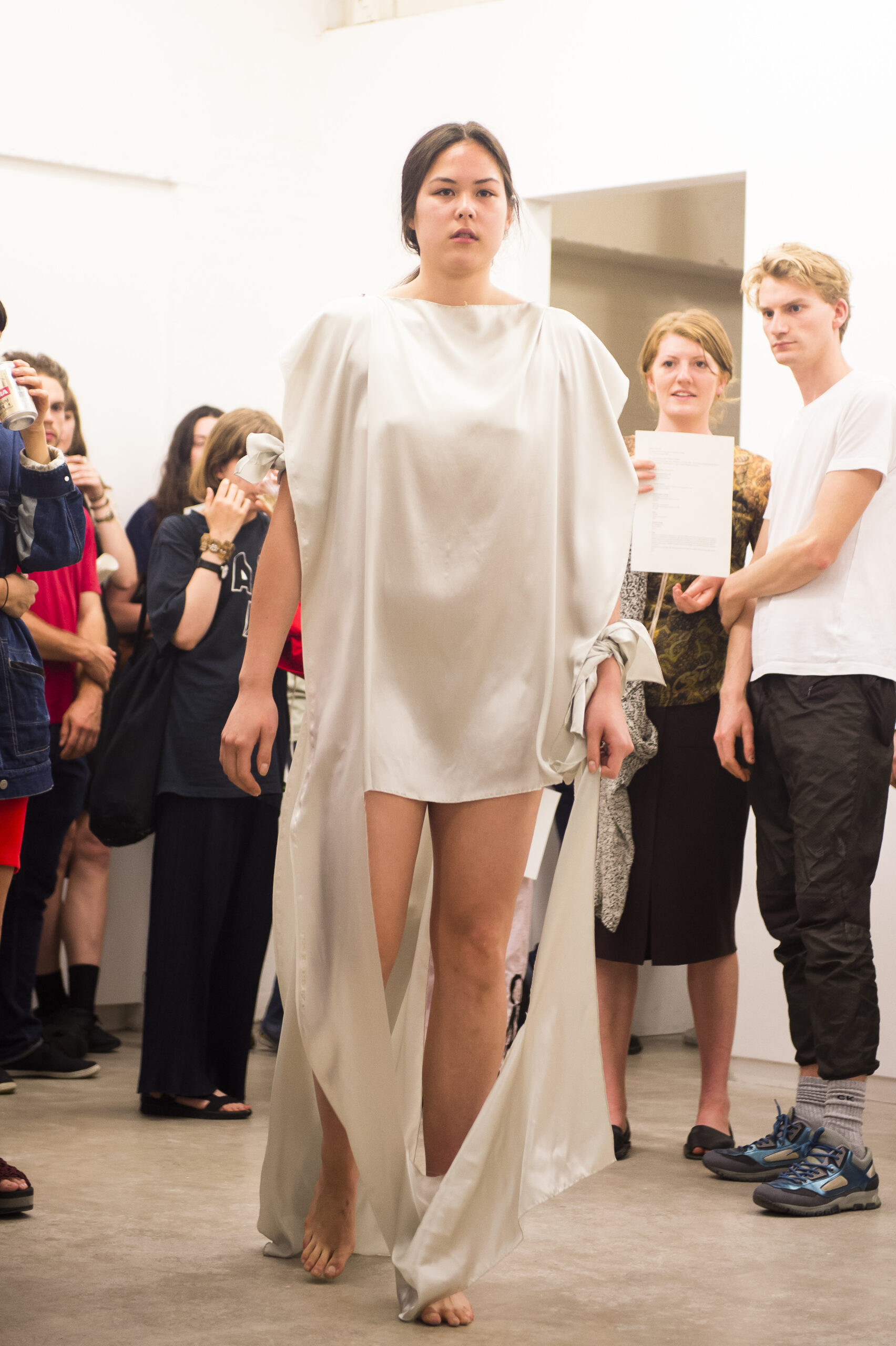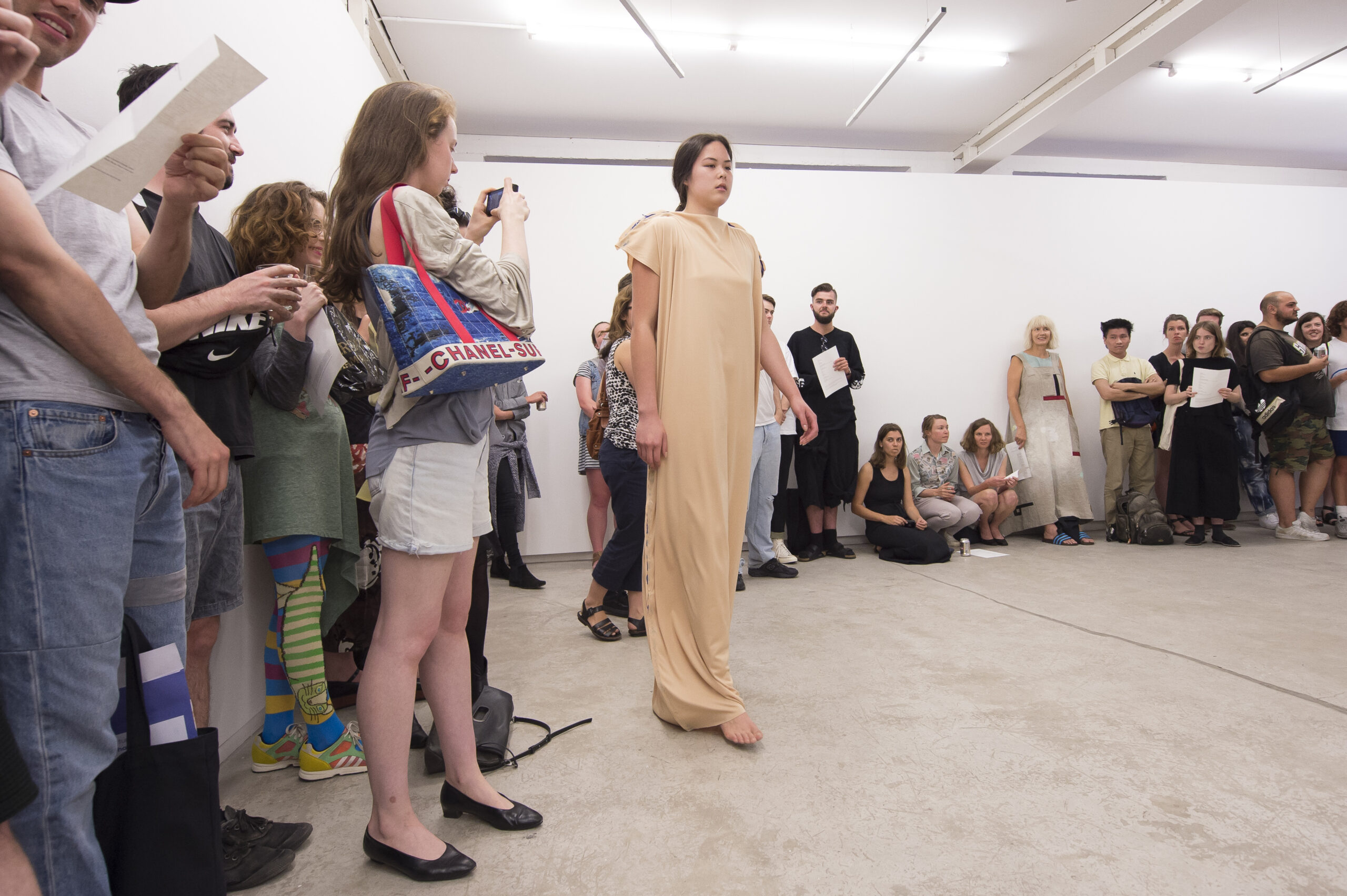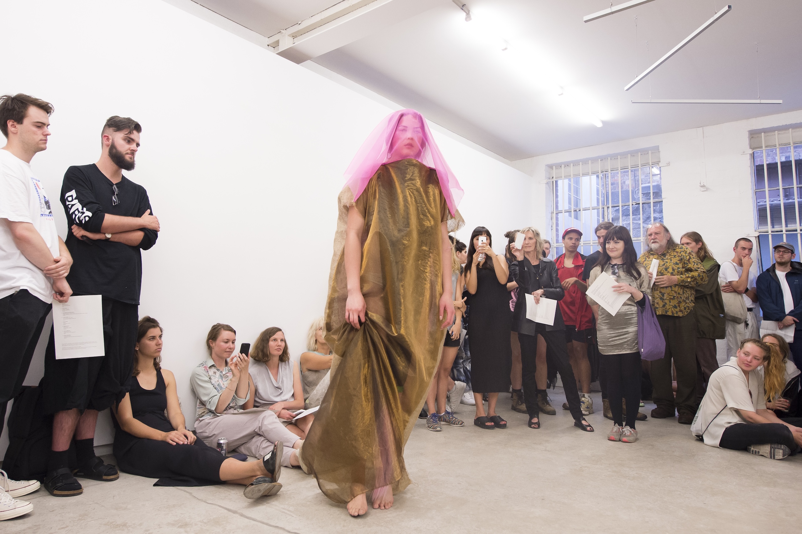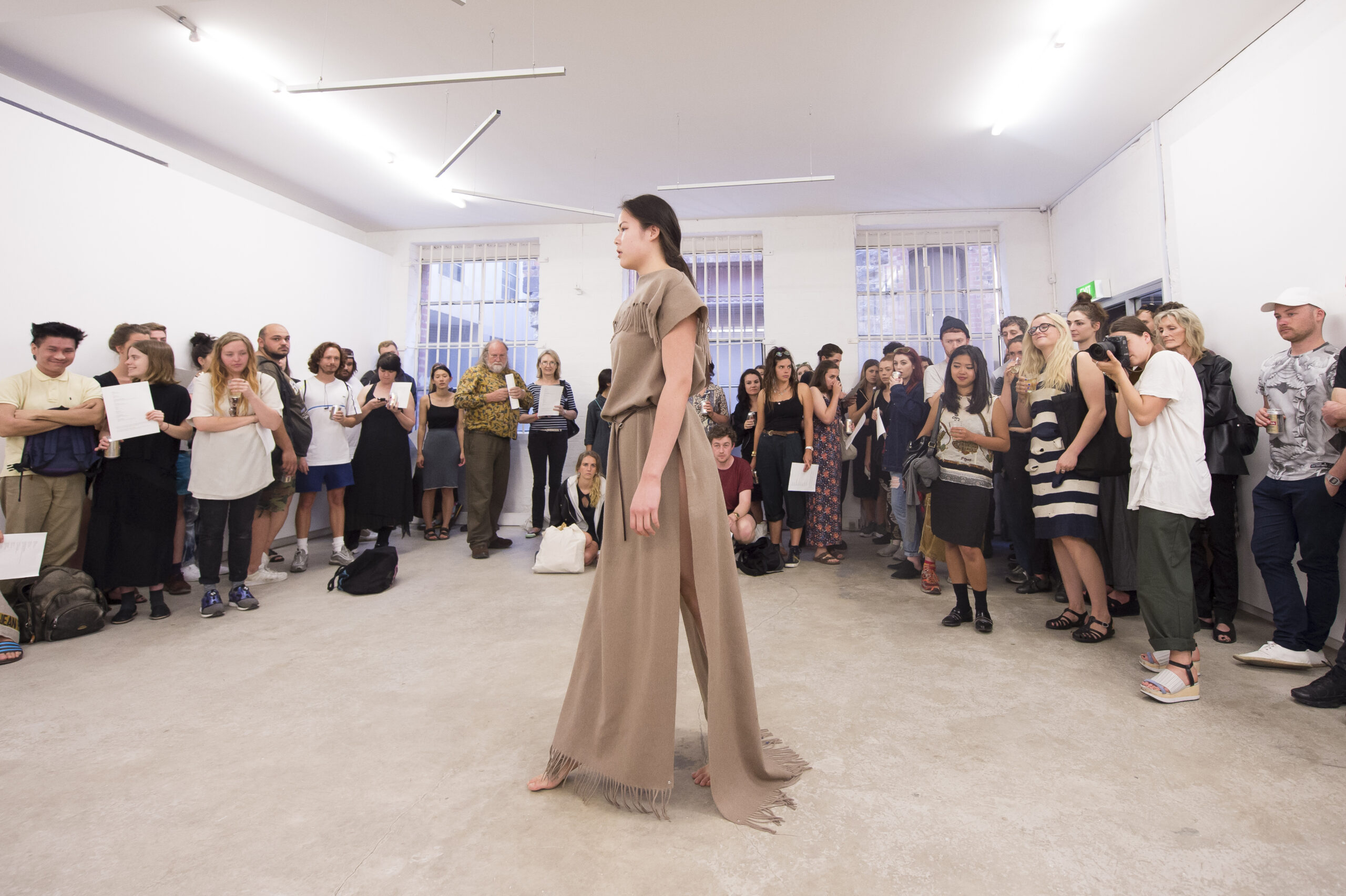 Each work is first revealed in a catwalk performance on opening night, worn by a lone model. She glides through the gallery along a set path before returning backstage to don the next canvas. Once the procession ends, the garments are lifted as wall hangings—hung from suspended poles threaded through their armholes.
