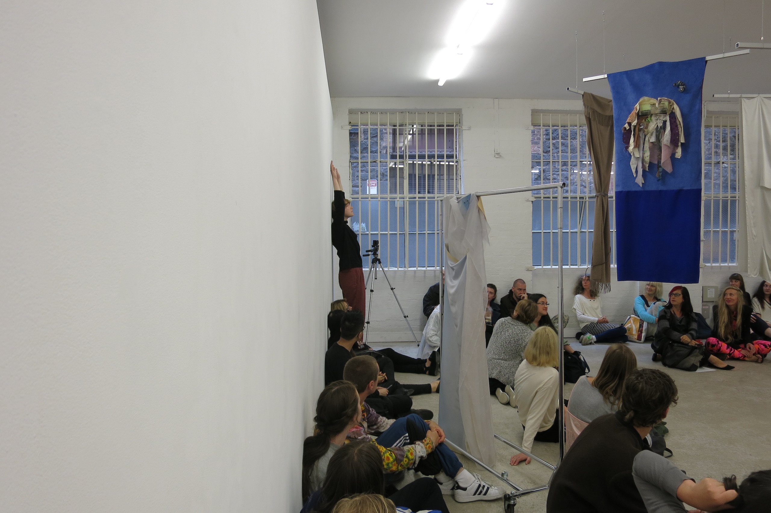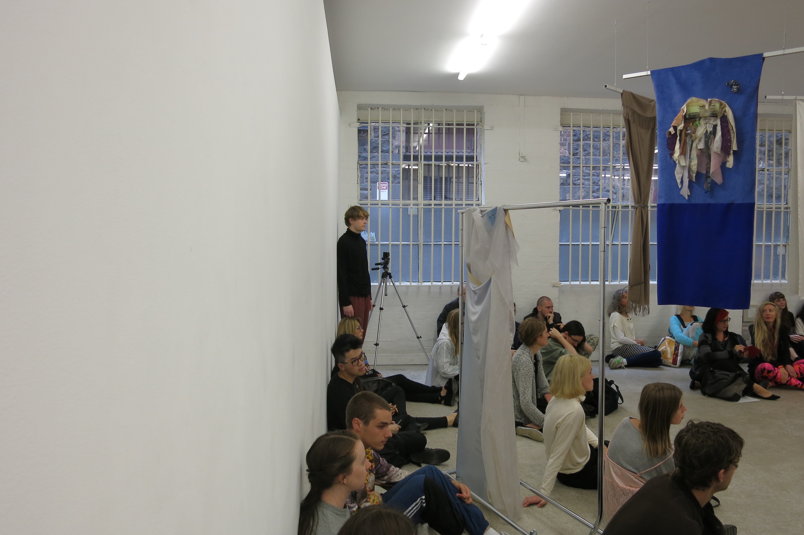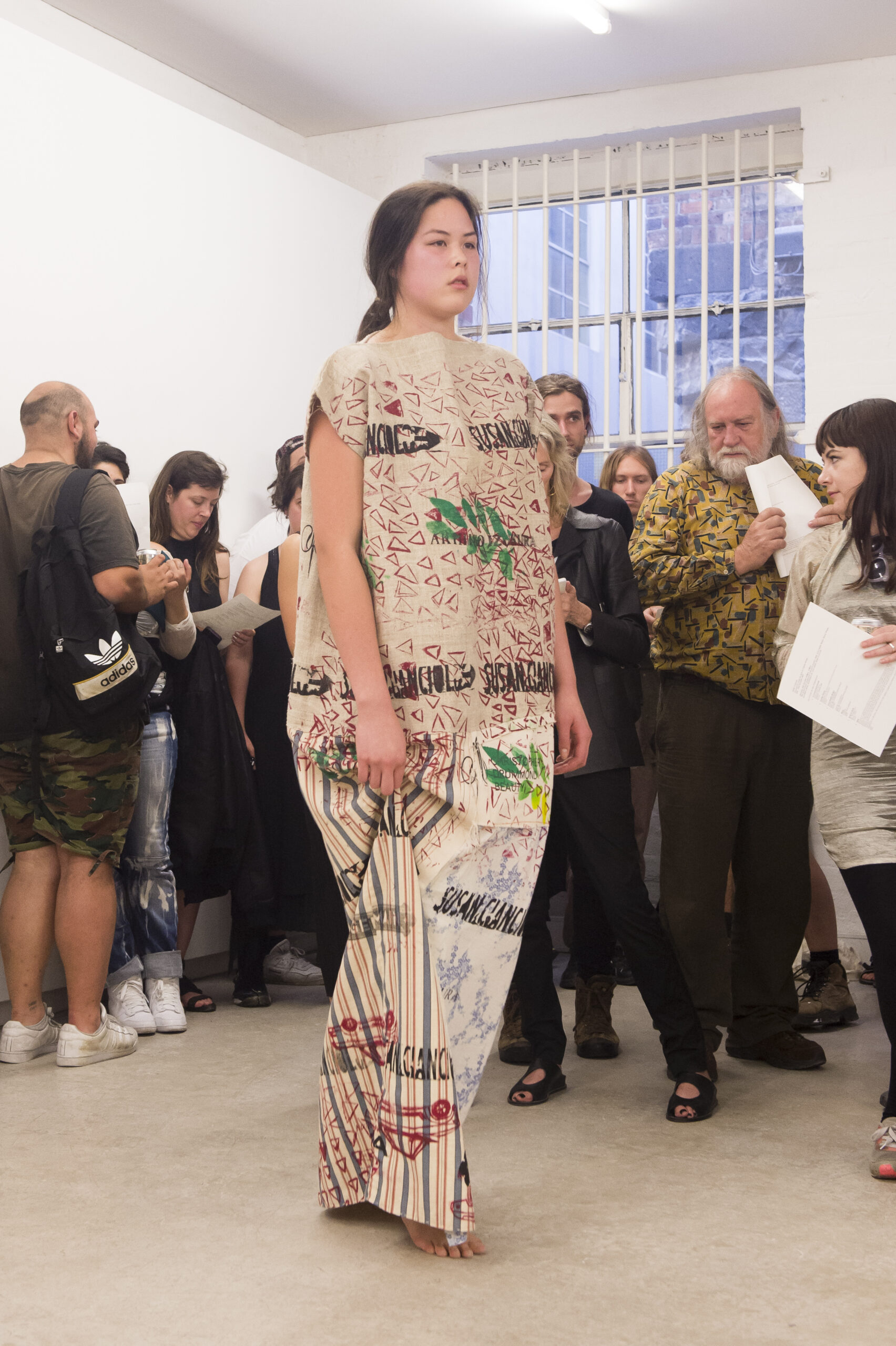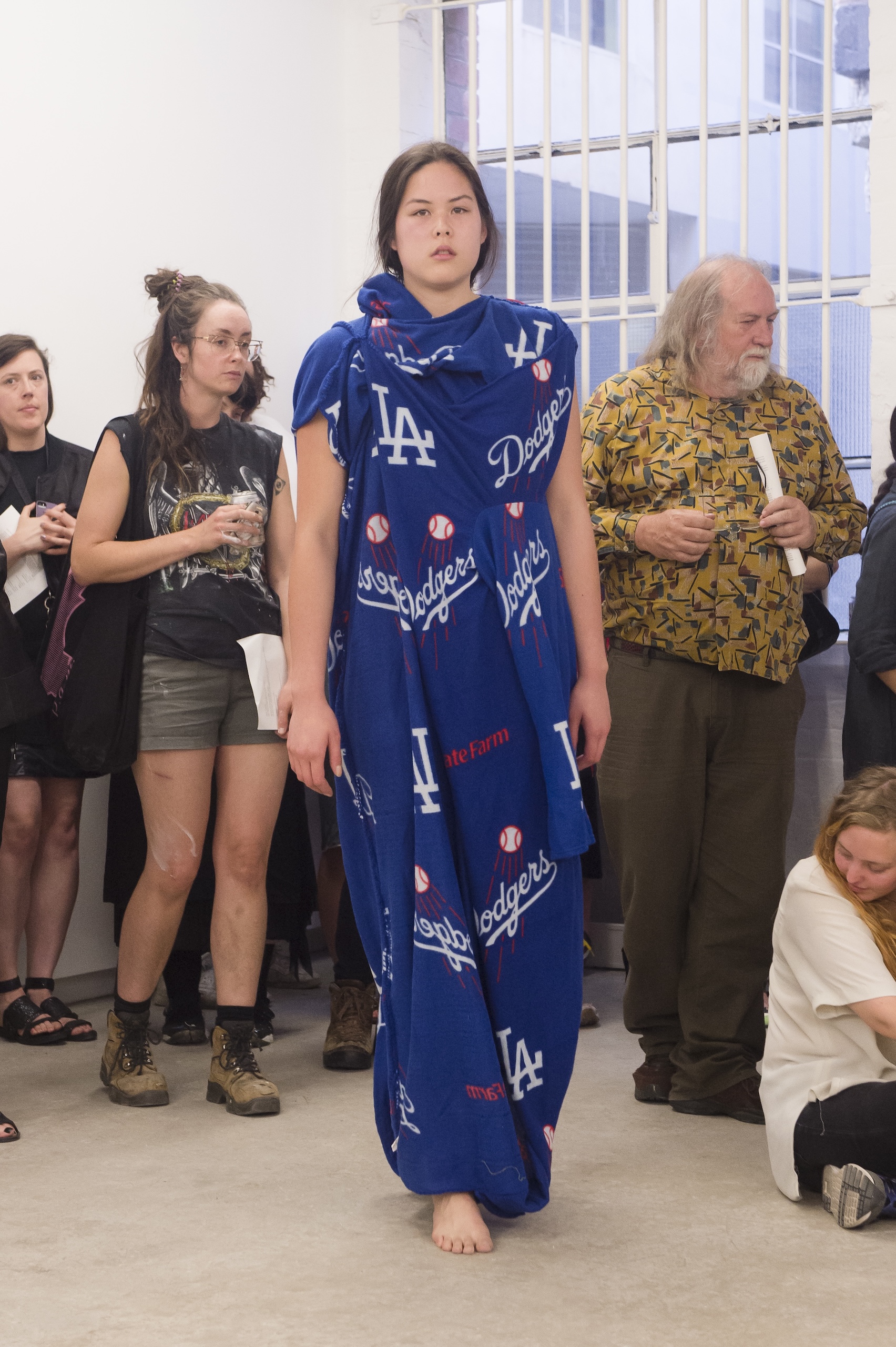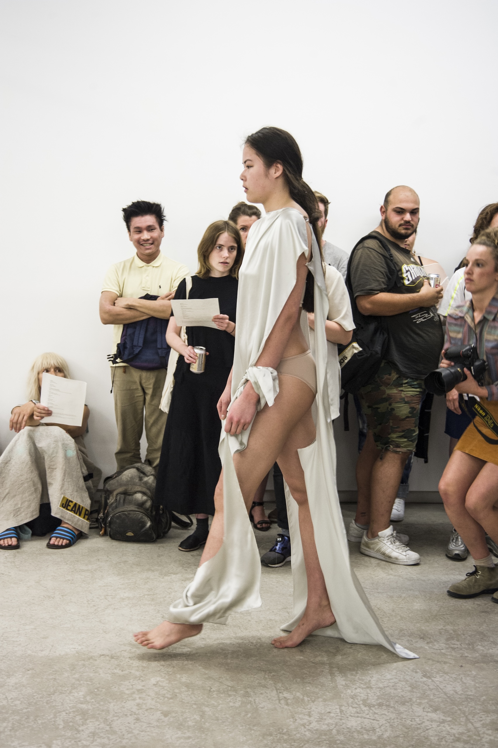Each work is first revealed in a catwalk performance on opening night, worn by a lone model. She glides through the gallery along a set path before returning backstage to don the next canvas. Once the procession ends, the garments are lifted as wall hangings—hung from suspended poles threaded through their armholes.