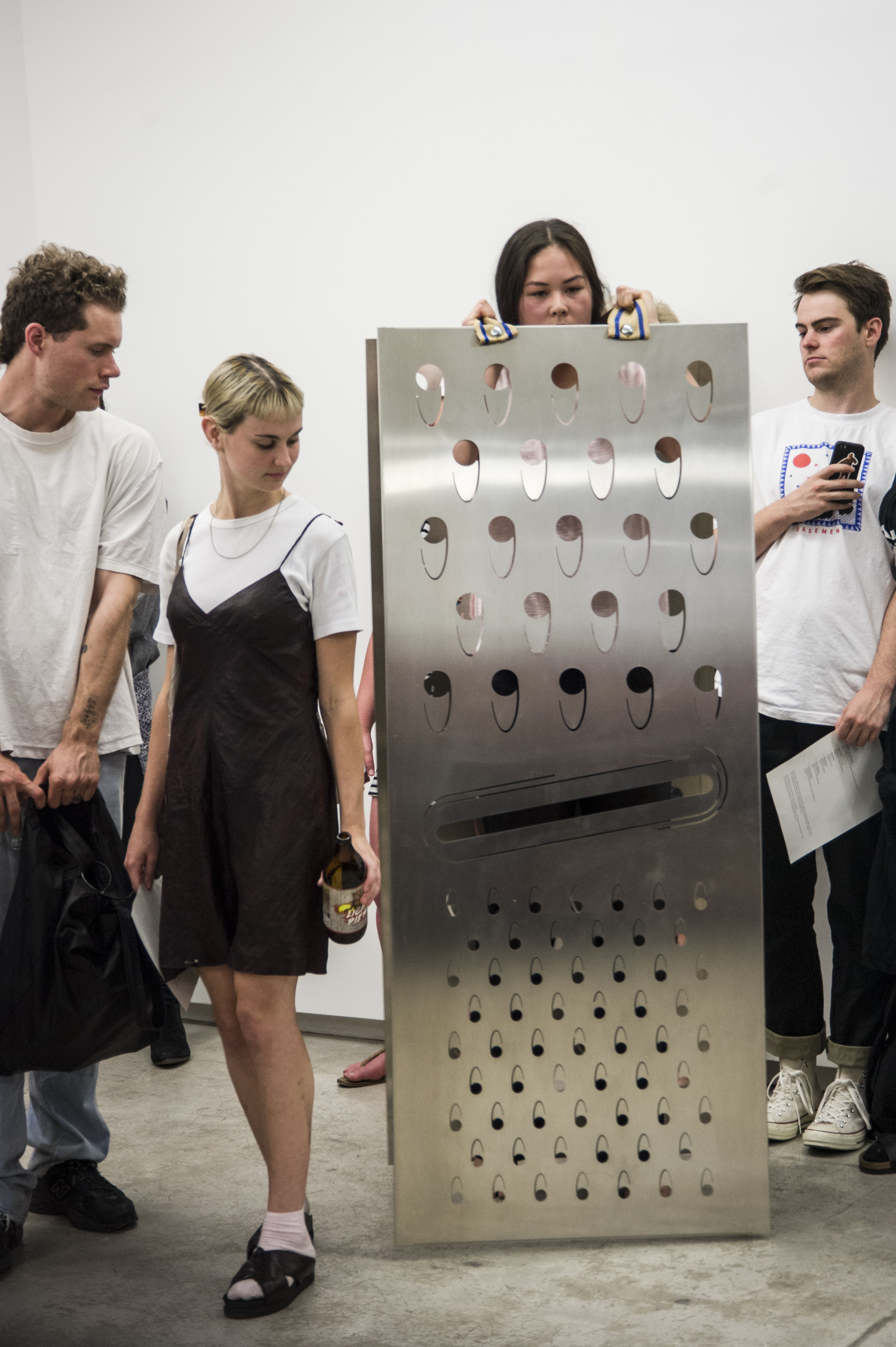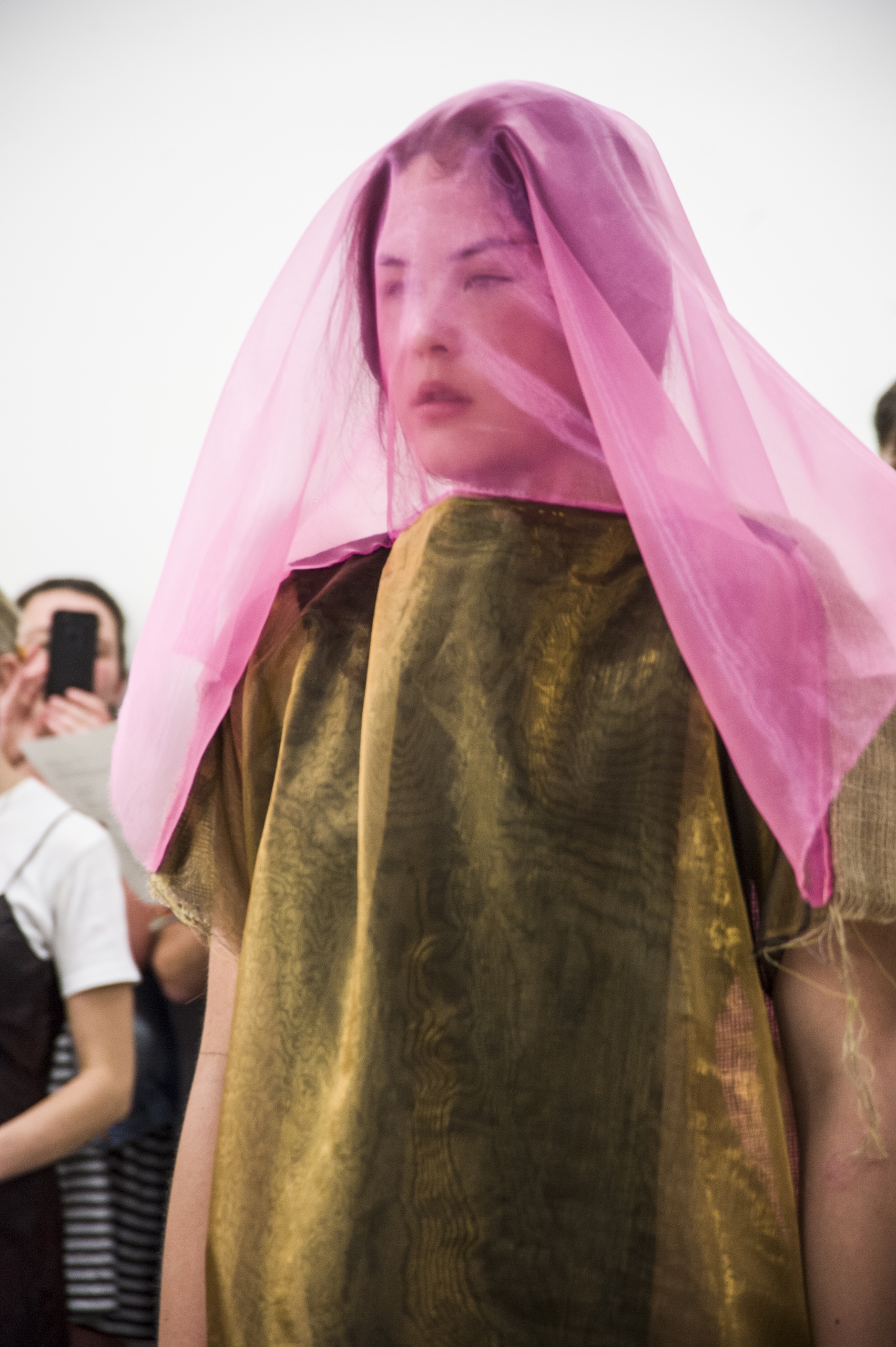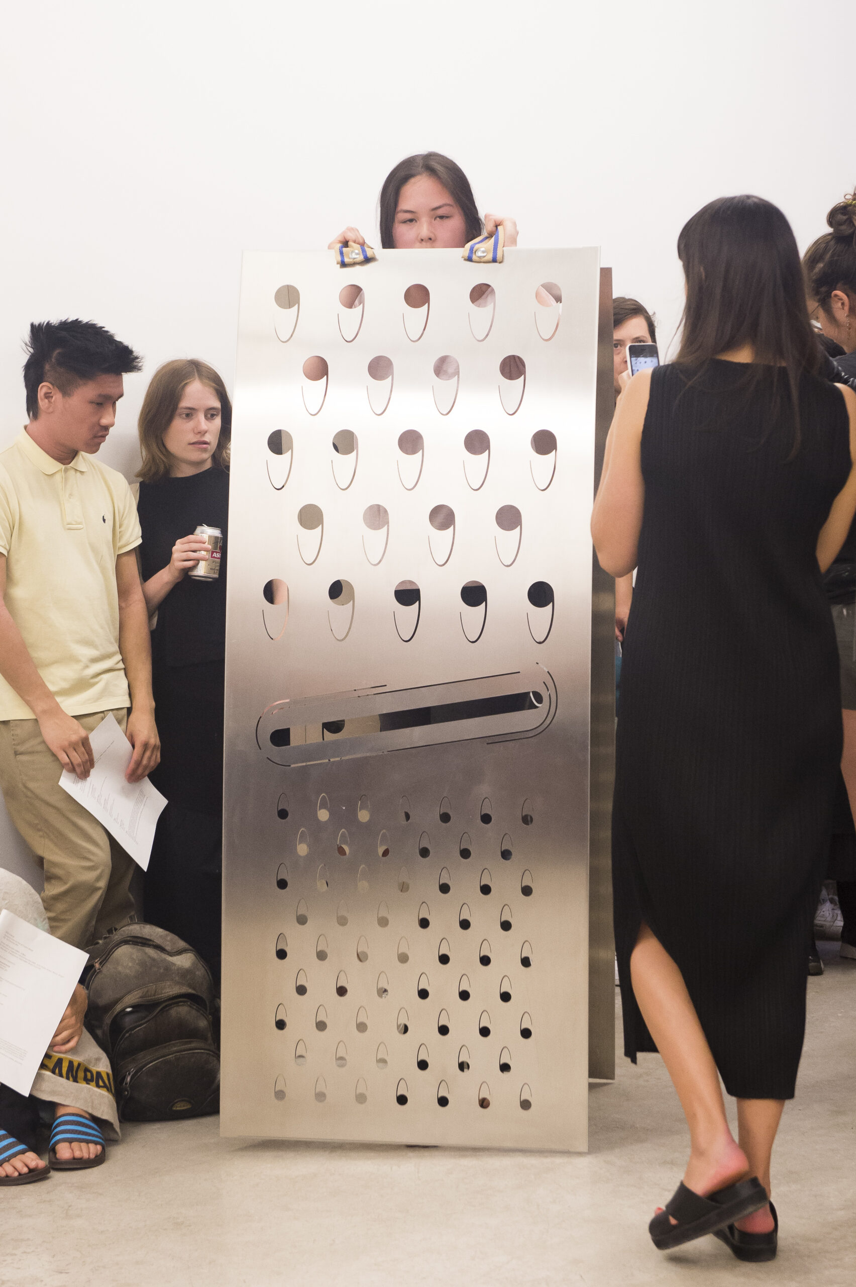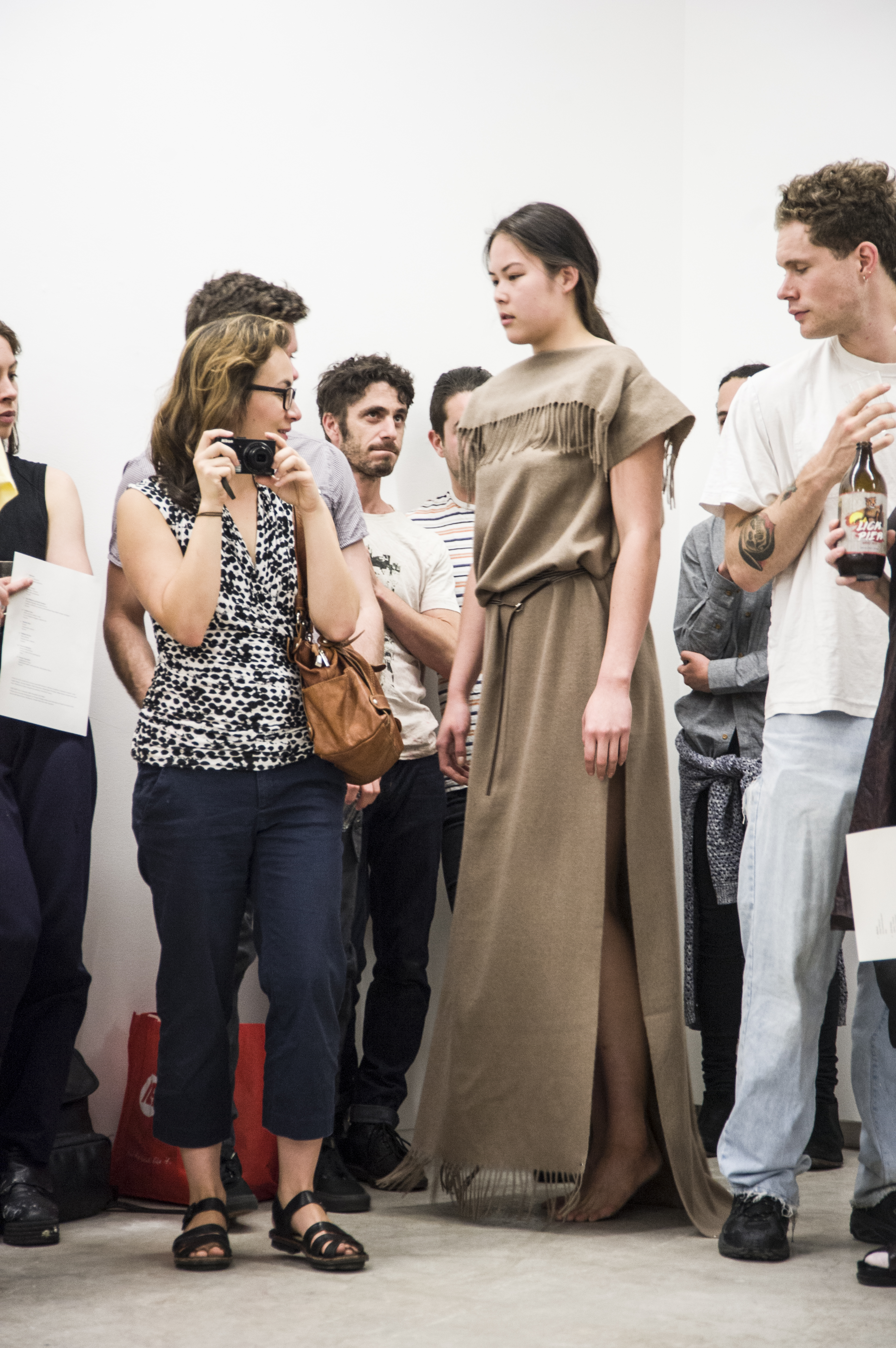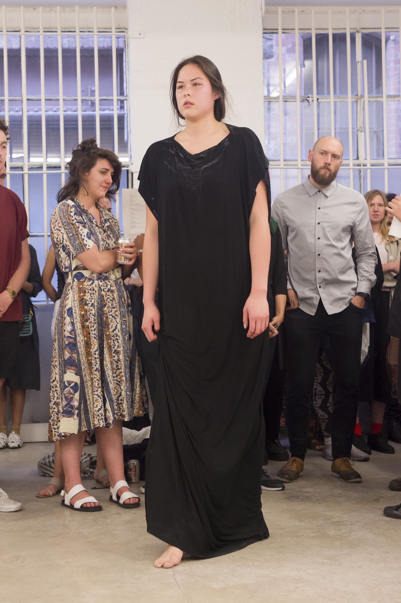 Each work is first revealed in a catwalk performance on opening night, worn by a lone model. She glides through the gallery along a set path before returning backstage to don the next canvas. Once the procession ends, the garments are lifted as wall hangings—hung from suspended poles threaded through their armholes.